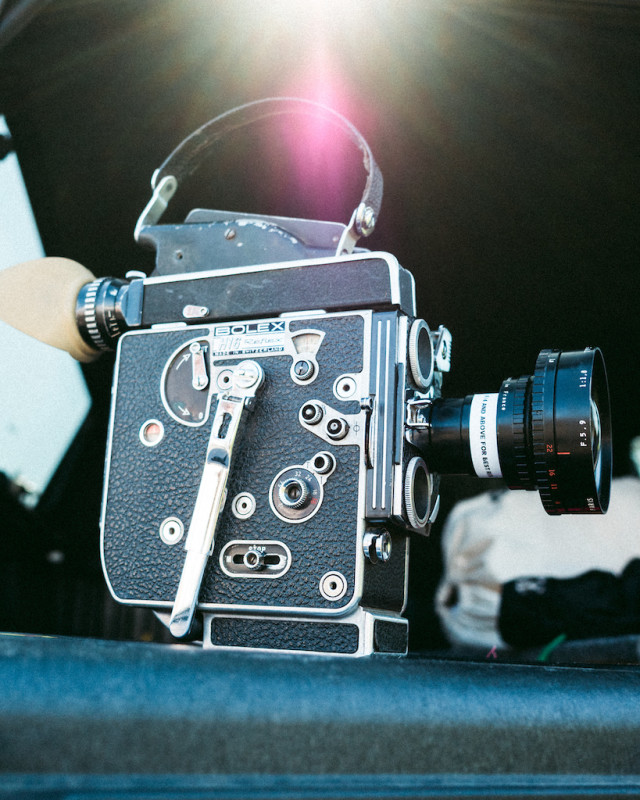 Boxold modified the camera to shoot Super 16mm, which is slightly wider than regular 16mm and renders a 16x9 aspect ration. Ten seconds of shooting on 16mm costs $5. He says the limitations of the heavy camera and expensive, limited film forces him to lock in and be fully in the moment when filming.