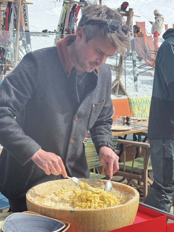 On day three, we stopped for lunch at Maya Altitude and sat on the large terrace to take advantage of the 360-degree views and soak up the sun. Maya’s reputation for high-altitude gastronomy is well-earned. I ordered the tagliolini, prepared table-side. The chef set a hollowed-out Parmesan wheel ablaze to melt the cheese, tossed in the pasta and butter, and served it with shaved truffles. €67 for pasta might seem like a lot, but it was worth every cent. The dessert selection was a dazzling array of freshly baked tarts, meringues, ganaches, pies, mousses, and cakes. We devoured the blueberry tart.