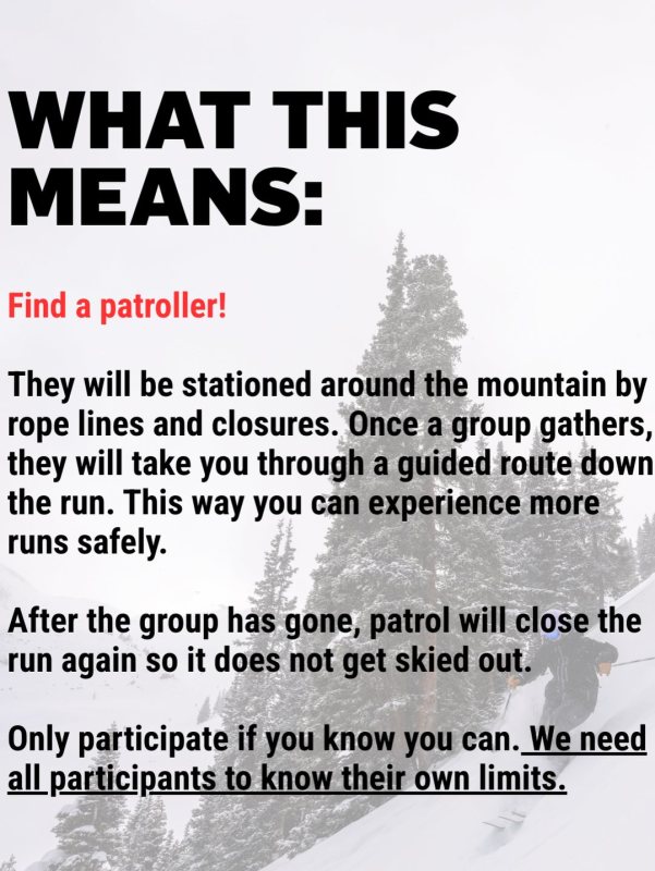 “Patrol is still hard at work managing the safety of terrain and helping injured parties, so be aware and do not just assume all of patrol is there to take you on a private tour!” a spokesperson for the mountain said in an email. “You'll know it when you see it—they'll be waiting by closed terrain and looking to chat, a group may be gathering.”