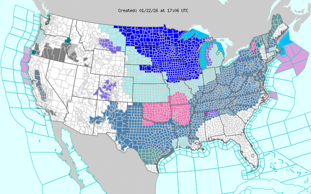 CNN reported that, as of Thursday, more than 120 million people were facing winter storm alerts, from extreme cold to ice storms. The forecasted band of precipitation and frigid temperatures stretches from the South all the way to the Northeast.