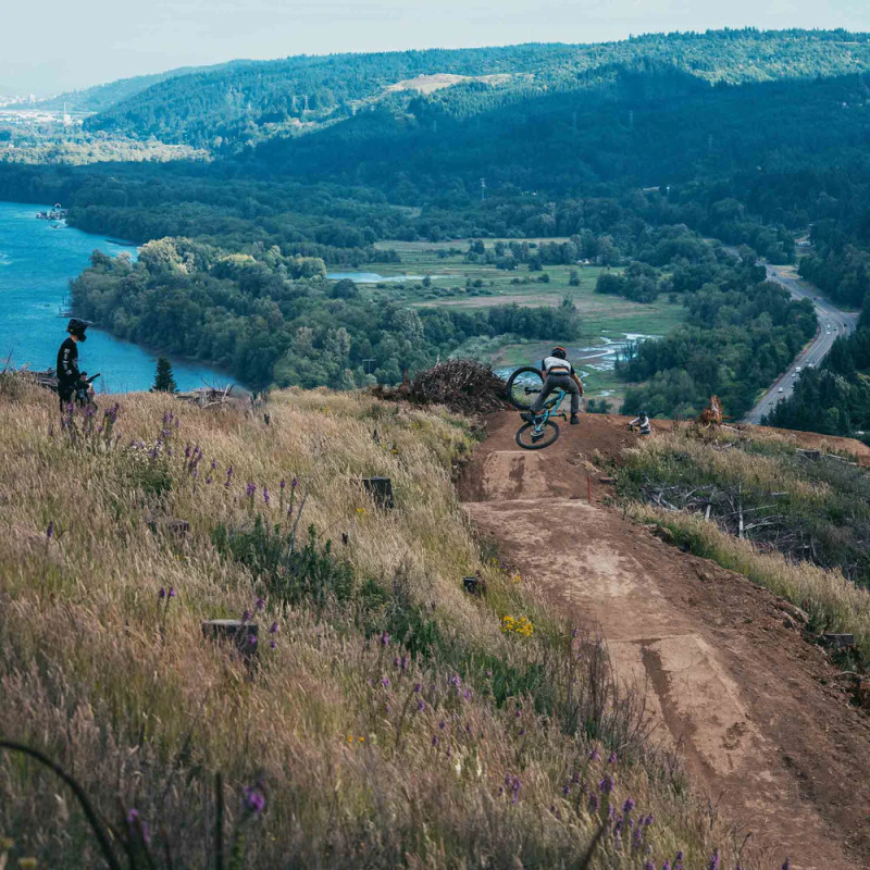 Stumpocalypse is on the Southside of the Rocky Point Trail System, at the end of the newly added Gappuccino jump trail. The trail corridor was initially cut in before new trees were planted, following previous logging operations. NWTA preemptively excavated the rough corridor to safeguard the future construction. Now completed, Stumpocalypse provides stunning views of the Willamette River, Sauvie Island, and the Portland skyline, and is packed with big sends.