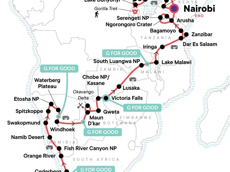 Sure, 55 days might sound like a lot of time, but this once-in-a-life time experience offers you the gift of time in some of the most epic landscapes in the world. See swaths of south and east Africa as you journey by Lando (overland adventure vehicle) across open savanna and by traditional canoe into the Okavango Delta. Track mountain gorillas deep in the Ugandan tropical rainforest and search for the “big five” on safari drive in the Serengeti and listen to the thundering Victoria Falls to get a real sense of how large Africa truly is. Enjoy wilderness camping to bring you even closer to the region’s landscapes and wildlife and try not to blink because a jam-packed adventure awaits.