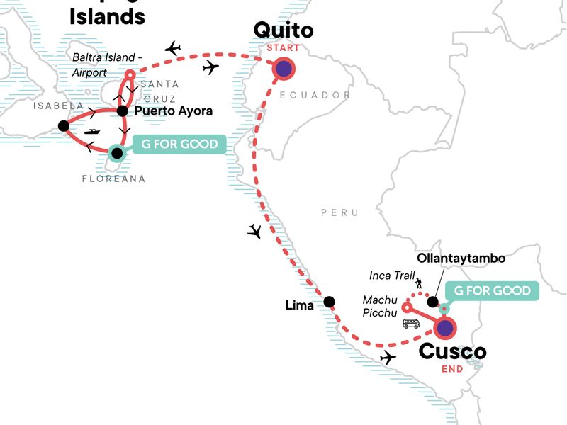 Encounter the magnificent wildlife of the Galapagos Island and swim with sea turtles and manta rays, Cycle on Isabela Island, Hike the Sierra Negro Volcano, Visit the Charles Darwin Research Station, Sample seafood in Lima, Soak in the views and culture of the Sacred Valley, Conque the mighty Inca Trail to Machu Picchu, Learn ancient traditions at the G Adventures-supported women's weaving co-op