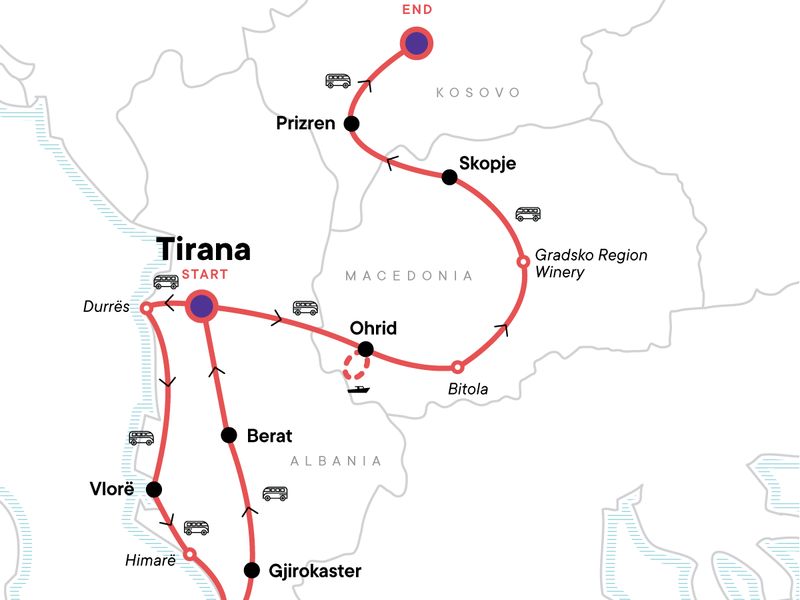 Your Foodie Moment: Regional Cooking Demonstration and Light Lunch, Ohrid. Evening orientaion walk of Tirana. Tour of the Durrës archaeological site. Orientation walk of Vlorë. Visit Himare. Entrance to the Ali Pasha Castle. Visit Butrint National Archaeological Park. Walking tour of Gjirokastër. Walking tour of Berat. Boat cruise on Lake Ohrid. Walking tour of Ohrid. Visit Bitola and walk along the Sirok Sokak. Winery tasting with light lunch. Skopje walking tour. Prizren orientation walk. Prizren Fortress sunset walk. Pristina walking tour. All transport between destinations and to/from included activities.