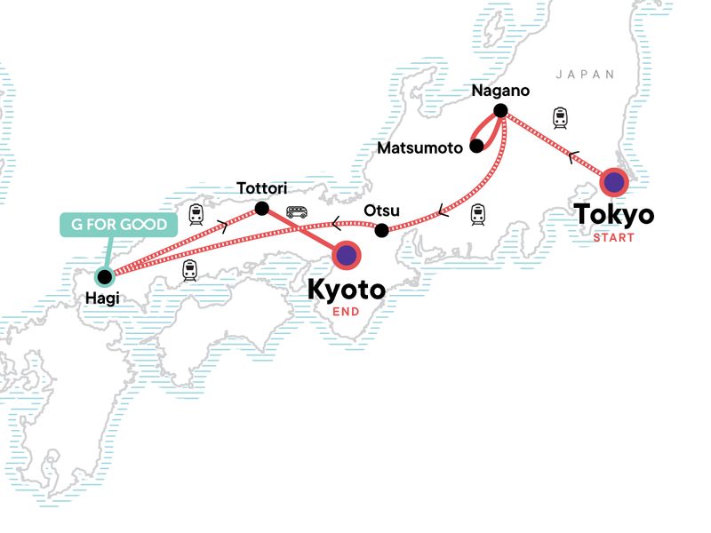 Your Hands-On Moment: Traditional Paper-making Lesson, Mihomisumi. Modern Tokyo walking tour. Zenkoji Temple visit (Nagano). Jigokudani Monkey Park visit (Nagano). Matsumoto Castle visit. Hagi Community Homestay welcome ceremony. Hagi cycling tour. Tottori sand dunes visit. Tottori fish market visit. Fushimi Inari Taisha shrine visit. Japan Rail (JR) pass (7 days). All transport between destinations and to/from included activities.