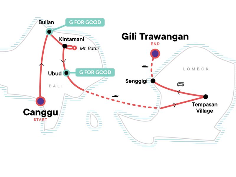 Your Big Night Out Moment: in Gili Trawangan, Gili Trawangan. 2-hour surf lesson in Canggu. Free time in Canggu. Ulun Danu Temple. Bulian Village Tour with local guide. Camping in Kintamani. Mt Batur sunrise hike + hot spring soaks. Free time in Ubud. Half-day rice terrace & village walk (5km guided walk) and Pringgasela weaving village visit (traditional loom demonstration) Afternoon tea at Aranka homestay. Bonjeruk Village immersion experience. Free time in Gili T. Gili Trawangan 3-Island Snorkeling Tour. All transport between destinations and to/from included activities.