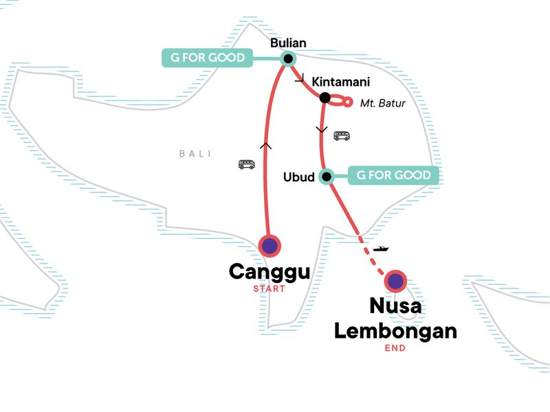 Your Discover Moment: Ubud. 2-hour surf lesson in Canggu. Ulun Danu Temple. Bulian Village Tour with local guide. Camping in Kintamani. Mt Batur sunrise hike + hot spring soaks. Seaweed farm hands-on activity. Devil’s Tear cliff visits in Lembongan. All transport between destinations and to/from included activities.