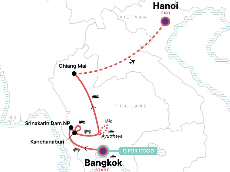 Your Foodie Moment: Street Food Dinner in Chinatown, Bangkok. Bangkok Klong Riverboat Tour. Visit Hellfire Pass and Ride the Death Railway. Visit Bridge on the River Kwai and Thai/Burma Railway Centre and Allied War Cemetery. Visit a Local Rice Farm. Ayutthaya Cycling. Boat Tour. Chiang Mai Old Town Orientation Walk. Chiang Mai Night Market Walk. Sunrise Alms Giving. Doi Suthep Temple Visit. Hanoi Old Town Cyclo Tour. Bia Hoi Corner and Microbrewery Crawl. All transport between destinations and to/from included activities.