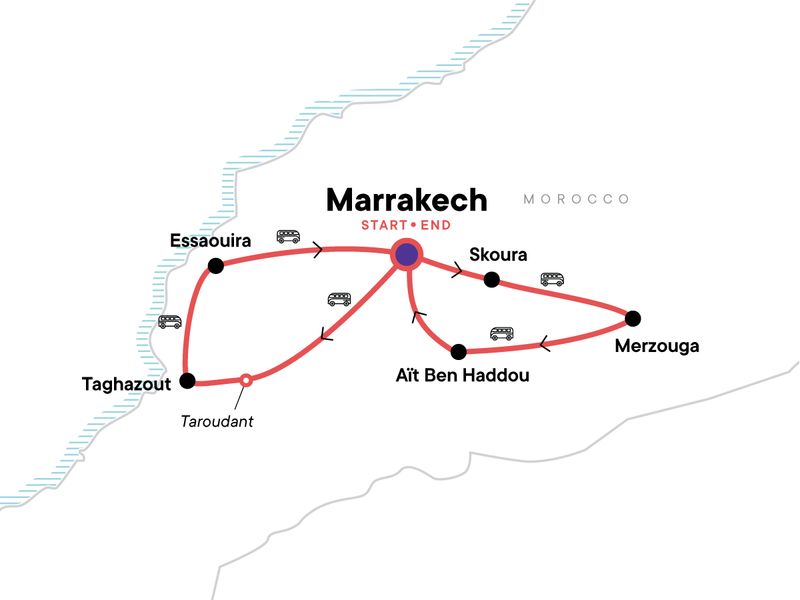 Your Big Night Out Moment: Marrakech. Dades Gorge walk. Sand boarding in the desert dunes. Guided medina visit in Marrakech. Sunset camel ride in the desert. Traditional dinner and drums under the stars. Aït Ben Haddou kasbah tour. Surf lesson in Taghazout. Sunset beach bonfire. Essaouira orientation walk. All transport between destinations and to/from included activities.