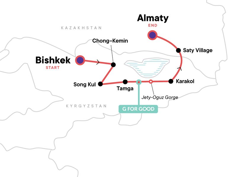 Your Local Living Moment: Tamga Village Stay, Tamga. Bishkek City Tour. Burana Tower. Home-cooked traditional dinner. Overnight in a Yurt. Free time in Chong-Kemin. Song Kul Lake. Lunch with Local Family in Kochkor. Skazka "Fairytale" Canyon. Tamga Village Stay. Yurt Building Demonstration. Jety Oguz & the Seven Bulls. Karakol City Tour. Russian Orthodox Cathedral. Dungan mosque. Saty Village Stay. 4x4 ride to Kaindy Lake. Charyn Canyon. Almaty City Tour. Independence Square, Zenkov Cathedral, Panfilov's Park. WWII memorial. Free time in Almaty.