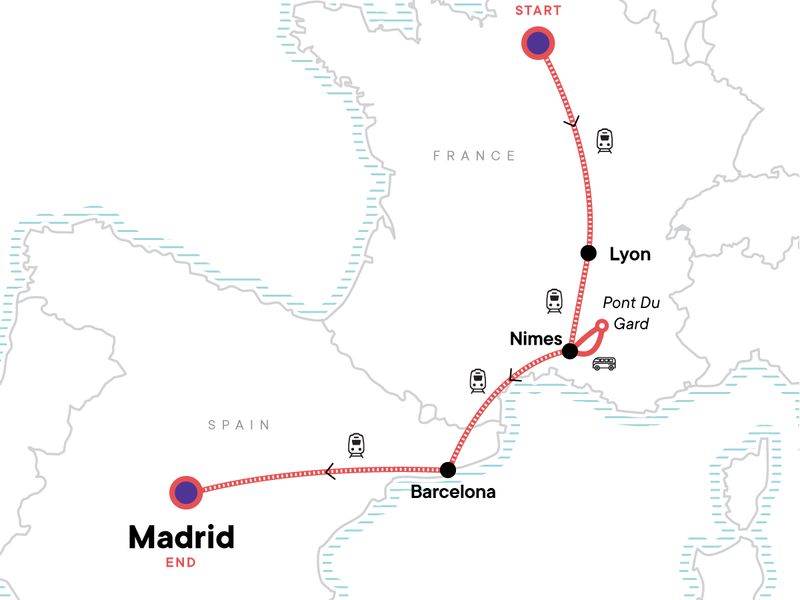 Your Foodie Moment: Farm-to-Table Lunch, Argilliers. Paris-by-night orientation walk. CEO-led walking tour of Paris. Lyon walking tour. 48-hour Lyon metro card. Guided walking tour of Nîmes' Old City and Amphitheatre visit. Visit Pont Du Gard. Guided walking tour of Barcelona. 24-hour Barcelona metro ticket. All transport between destinations and to/from included activities.