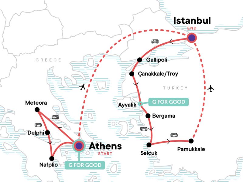 Your Foodie Moment: Cooking Class Athens, Athens. Athens orientation walk. Guided tour of the Acropolis and Parthenon. Acropolis and Parthenon entrance fees. Visit the site of Thermopylae Information Center. Guided tour of Ancient Delphi. Visit the Corinth Canal. International flight from Athens to Istanbul. Gallipoli battlefields entrance and guided visit. Troy entrance and guided visit. Ephesus entrance and visit. Ancient Hierapolis and Pamukkale entrance and guided walk. Istanbul city walking tour. Internal flight from Pamukkale to Istanbul. All transport between destinations and to/from included activities.