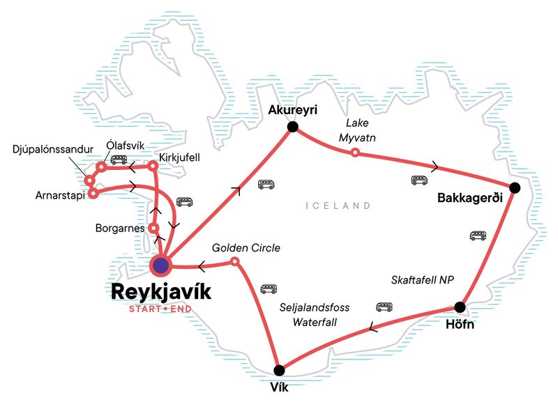 Your Wellness Moment: Sky Lagoon Geothermal Hot Springs, Reykjavik. Local guesthouse stay (Borgarfjörður). Mývatn lake visit. Vatnajökull glacier visit. Jökulsárlón glacier lagoon visit. Reynisfjara beach. Seljalandsfoss waterfall. The Golden Circle: Gullfoss waterfall, Geysir Hot Springs, and Þingvellir National Park. Enjoy a soak in Sky Lagoon just outside of the city. Day tour of the Snæfellsnes Peninsula. All transport between destinations and to/from included activities.