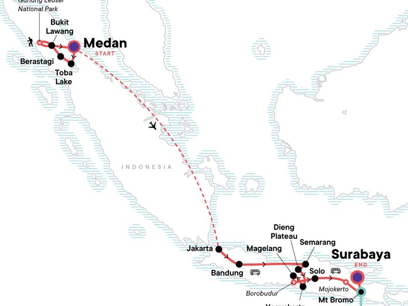 Orangutan Trekking in Gunung Leuser National Park, Visit Lake Toba the world's largest volcanic lake, Explore Samosir Island, Enjoy a guided tour of local indigenous Batak Village, Adventure through Sumatra's biggest city Medan, Explore lesser visited temples, Visit Kota Tua Old Town, Fill up on a traditional Sundanese lunch, Visit the beautiful Dieng Plateau on a full day tour, Explore Western Java and have free time in Jakarta, Adventure through Central Java, Experience local life on a biking tour through Wanjurejo and Borobudur Villages, Support a community tourism enterprise in Candijero village, Overnight in a G Adventures supported community homestay, Take a thrilling jeep ride through Mount Bromo during sunrise