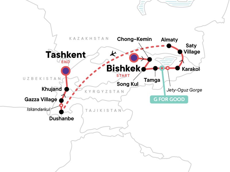 Your Local Living Moment: Community Guesthouse, Ghazza. Bishkek City Tour. Burana Tower. Home-cooked traditional dinner. Overnight in a Yurt. Free time in Chong-Kemin. Song Kul Lake. Lunch with Local Family in Kochkor. Skazka "Fairytale" Canyon. Tamga Village Stay. Yurt Building Demonstration. Jety Oguz & the Seven Bulls. Karakol City Tour. Russian Orthodox Cathedral. Dungan mosque. Saty Village Stay. 4x4 ride to Kaindy Lake. Charyn Canyon. Almaty City Tour. Independence Square, Zenkov Cathedral, Panfilov's Park. WWII memorial. Free time in Almaty. Dushanbe City tour. Alexander the Great's lake. Hike to Iskander Darya waterfall. Fann Mountains. Voru Village Hike and Blacksmith. Free time in Ghazza Village. Istaravshan Mosque and Lenin Bust visit. Khujand City Tour. Museum of Sughd. Mausoleum of Sheik Muslekheddin. Khujand market.
