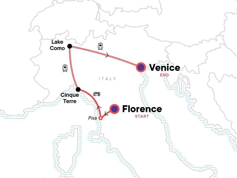 Explore Florence's cobblestone streets and world-class art galleries, Explore the stunning landscapes and villages of Cinque Terre on foot and by train, Explore the elegant countryside of Lake Como by boat, Wander along the canals and bridges of Venice, Indulge in the Italian gastronomy and local wines as you move throughout the regions