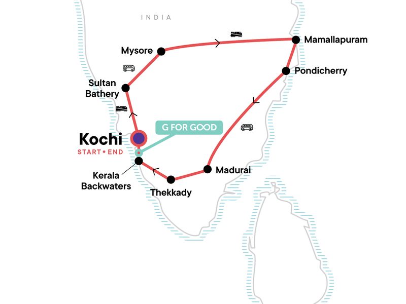 Your Local Living Moment: Kerala Backwaters Homestay, Alleppey. Fort Kochi orientation walk. Kathakali dance show. Wayanad Wildlife Sanctuary walk and safari. Chaumundi Temple and Mysore Palace visit. Mamallapuram Shore Temple visit. Pondicherry orientation walk. Madurai cycle-rickshaw ride and Sri Meenakshi Temple visit. Cardamom Hills spice plantation tour. All transport between destinations and to/from included activities.