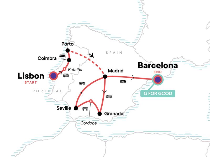 Your Hands-On Moment: Port Wine Cellar Visit, Porto. Orientation walks in Lisbon, Granada and Barcelona. Batalha gothic monastery entrance and visit. Porto orientation walk. Albaicin quarter visit. Alhambra guided tour. Mezquita Mosque and Jewish quarter visit in Cordoba. Flamenco show performance. Internal flight (Porto to Madrid). All transport between destinations and to/from included activities.