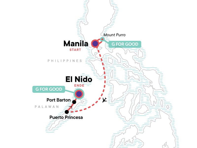 Your Welcome Moment: Welcome Moment - Meet Your CEO and Group. Intramuros walking tour. Manila Street Food & Jeepney Tour. Mount Purro Nature Reserve G for Good Experience. Iwahig Firefly Excursion. Puerto Princesa Subterranean River tour. Full day Port Barton Island Hopping tour. Sibaltan Indigenous community experience. Full day El Nido Snorkeling tour. All transport to and from included activities.