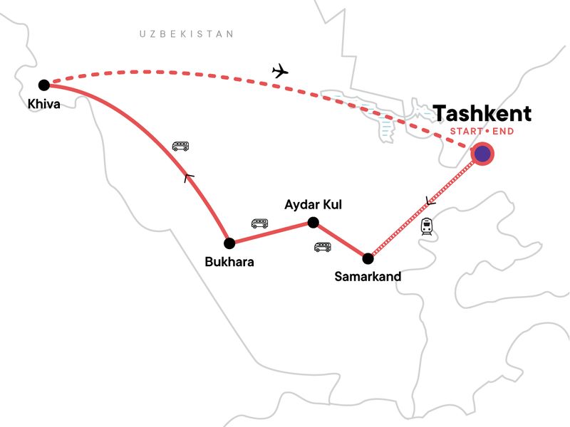Your Local Living Moment: Overnight in a Yurt, Aydar Kŭl Camp. Amir Timur Mausoleum Visit. Samarkand City Tour. Shaki Zinda complex, the bazaar, Bibi Khanum, and Registan Square. Free time in Samarkand. Chashma Complex and Holy Spring Visit. Fortress of Alexander the Great Visit. Aidarkul Lake. Authentic Uzbekistan dinner. Evening Kazakh singing show. Overnight in a Yurt. Free time in Bukhara. Bukhara City Guided Tour. UNESCO-listed Khiva Ancient City Exploration. Free time in Khiva. Tashkent Guided City Tour. Free time in Tashkent.