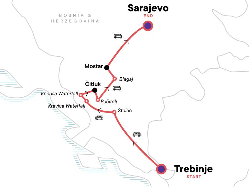 Your Big Night Out Moment: Sarajevo. Trebinje orientation walk. Explore the Počitelj Fortress and art colony. Visit Kravica Waterfall. Take a sunset jeep safari in search of wild horses. BBQ dinner and bonfire in Livno. See the Dervish Monastery and explore Blagaj. Guided walking tour of Mostar. Whitewater rafting on the Neretva River with bbq lunch. Transport to/from all included activities and between all destinations.