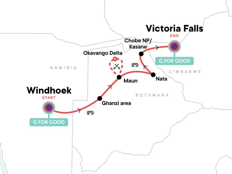 Get ready to check another country off your list as the group crosses the border from Namibia into Botswana. Travel east into the heart of the Kalahari to Ghanzi. Catch a glimpse of how the Indigenous San Bushmen adapted to this difficult landscape on a San bushman walk. Then while the day comes to an end, enjoy the warm hospitality of the San Bushmen as the group will be staying at the G Adventures-supported Dqae Qare San Lodge & Camp. The best part? You are making a difference in the lives of this community just by enjoying your time at camp. So sit back, allow yourself to become immersed in their history and culture, sit around the fire, and simply enjoy the moment. Continue through the eastern part of Namibia and cross into Botswana before travelling into the heart of the Kalahari. Arrive in the late afternoon and camp in the Ghanzi area.