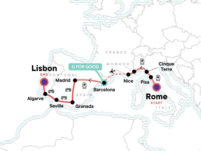 Your Big Night Out Moment: Lisbon. Visit to the Leaning Tower of Pisa. Cinque Terre park fee, unlimited train ticket, and CEO-led hike. Visit to Monaco. Tapas bar crawl (Granada). Free time on the Algarve coast (Portugal). Orientation walks in Barcelona, Granada, Lisbon, and Madrid. All transport between destinations and to/from included activities.
