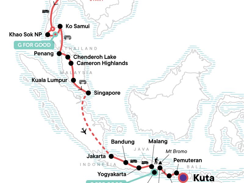 Your Big Night Out Moment: Kuta Dance Party, Kuta. Ang Thong National Marine Park Visit. Orientation walks in Cameron Highlands and Bandung. Entrance to Bromo Tengger Semeru NP. Mt Bromo crater walk. Sunrise hike to Mt Bromo viewpoint. Street food crawls. Internal flight. All transport between destinations and to/from included activities.
