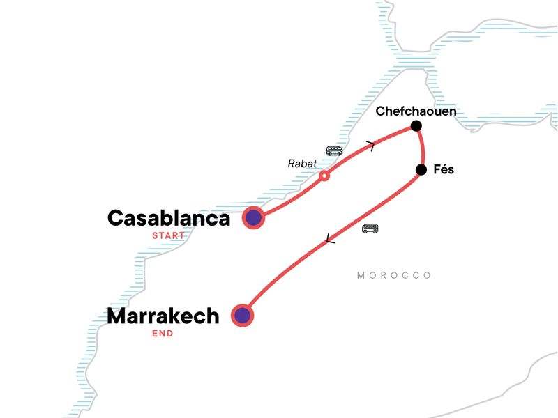 Your First Night Out Moment: Connect With New Friends. Enjoy free time in Rabat. Explore the blue city of Chefchaouen. Visit the medina and souks of Fès. Discover the bustling city of Marrakech. All transport between destinations and to/from included activities.