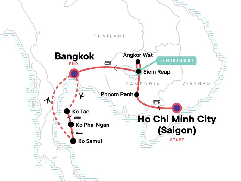 Visit three of Southeast Asia's most compelling destinations on this 16-day tour that combines culture and food with time for kicking back. Begin in bustling Ho Chi Minh City before continuing on to Phnom Penh and the legendary ancient temple complex of Angkor Wat. Experience the buzz of the Thai capital of Bangkok before heading southeast to the islands for swimming, relaxing, snorkelling, and all the beach time you could possibly want.