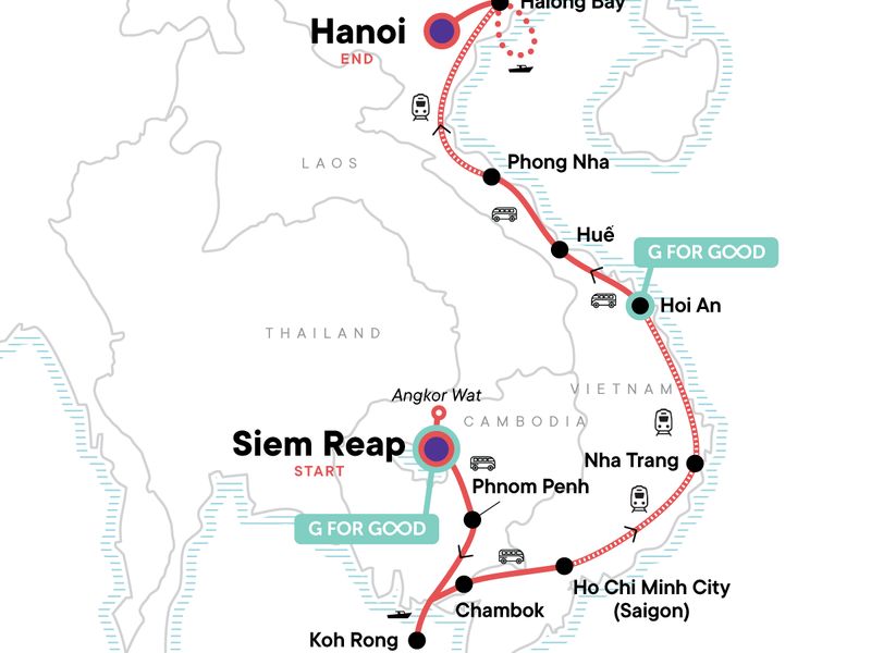 Your Big Night Out Moment: Reminisce Riverside, Hoi An. Guided sunrise tour of Angkor Wat temple complex. Traditional meal at the G Adventures-supported New Hope project or in a local home in a nearby village. Ferry boat from Sihanoukville to Koh Rong. Local living moment at Chambok Homestay including dinner. Orientation walks in Phnom Penh, Ho Chi Minh City, Hoi An and Hanoi. Two street food crawls in Phnom Penh and Nha Trang. Overnight train from Ho Chi Minh city to Nha Trang. Nha Trang to Danang and Phong Nha to Hanoi. Noodle making demonstration and lunch at Oodles of Noodles (Hoian). Halong Bay boat cruise with lunch. All transport between destinations and to/from included activities.