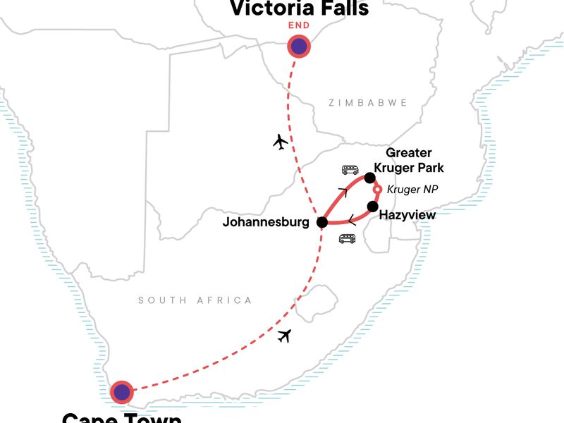 Your Discover Moment: Victoria Falls. Table Mountain cable car ride and visit. Nature Walk. Wildlife Safari Drive. Traditional Dinner and Local Dancing. Kruger National Park Open Vehicle Wildlife Safari Drive. Chimp Eden Tour. Simunye Theatre Show. Free time in Cape Town & Victoria Falls for optional activities in the area. Internal flights. All transport between destinations and to/from included activities.