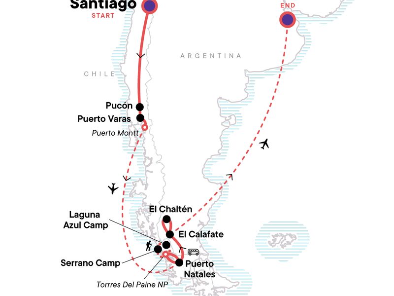 Camp for two unforgettable nights in Torres del Paine with mountains all around, Take your pick: hike volcanoes or chill in hot springs in the Lake District, Choose to wander colourful Valparaíso and cruise through Santiago on two wheels, Snap pics of the massive Perito Moreno glacier in Los Glaciares National Park, Ride an overnight bus like a local for a memorable travel experience, Soak up the energy of Buenos Aires to cap it all off with good food and late nights