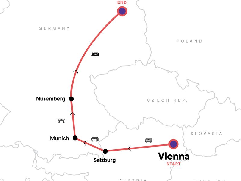 Your Welcome Moment: Welcome Moment - Meet Your CEO and Group, Vienna. Welcome meeting and dinner. Orientation walk in Vienna. Christmas markets visit Vienna. Coffee/pastry tasting Vienna. Private transfer to Salzburg. Free time in Salzburg. Salzburg Christmas market visits with CEO. Private transfer to Munich. Free time in Munich. Private transfer to Nuremberg. Christmas market visit in Nuremberg. Train ride to Berlin. Orientation walk in Berlin. Christmas market visit in Berlin. Mug of Glühwein (mulled wine). Free time in Berlin. 24hr transit pack in Berlin and Vienna.