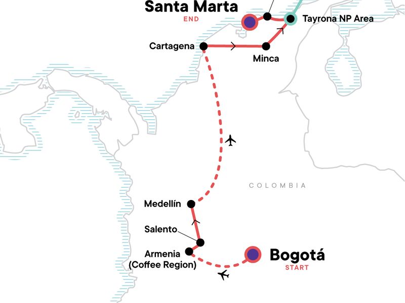 Your Discover Moment: Cartagena. Hacienda stay. Valle de Cocora hike. Medellín city tour.City tour in Cartagena. Tayrona National Park hike with local guide (5hrs). Taganga Orientation Walk. Internal flights. All transport between destinations and to/from included activities.