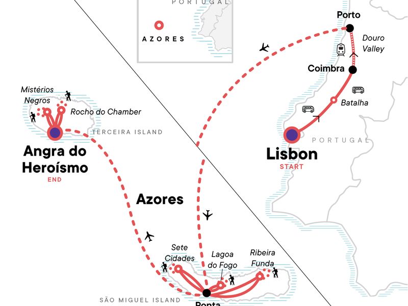 Your Hands-On Moment: Port Wine Cellar Visit, Porto. Lisbon orientation walk. Batalha gothic monastery entrance and visit. Porto orientation walk. Ribeira Funda to Maia hike. Angra do Heroísmo Walking Tour. Visit to the Terra Nostra Geothermal Hot Springs. Hike to the highest body of water in the Azores Lagoa do Fogo. Mistérios Negros trail Hike and Algar do Carvão lava caves. Sete Cidades Parish Hike. Rocha do Chambre hike. Internal flight. All transport between destinations and to/from included activities.