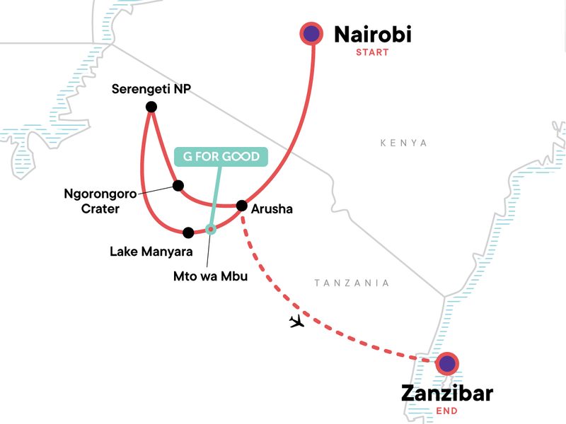 Your Welcome Moment: Welcome Moment - Meet Your CEO and Group. Lake Manyara wildlife safari drive. Serengeti wildlife safari drives. Ngorongoro Crater wildlife safari drive. Scenic flight from Arusha to Zanzibar. Orientation walk in Stone Town. Spice plantation guided tour. All transport between destinations and to/from included activities.