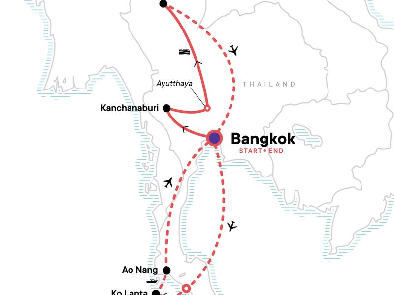 Your Welcome Moment: Welcome Moment - Meet Your CEO and Group. Wat Pho visit. Klong riverboat tour. Erawan Falls and Bridge on the River Kwai visit (Kanchanaburi). Thai-Burma Railway Centre and Allied War Cemetery visit. Temple ruins tour (Ayutthaya). Doi Suthep temple visit (Chiang Mai). Internal Flights. Beach barbecue (Ko Lanta). Half-day snorkelling boat trip through the Trang Islands (Ko Ngai). Free time on spectacular beaches. All transport between destinations and to/from included activities.