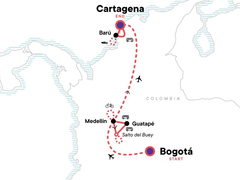 Your OMG Day: Canopy Cable Flight or Via Ferrata Waterfall Climb, Salto del Buey. Complimentary arrival transfer. Welcome dinner. Colombia Coffee Tasting Immersion Experience. Parque Arví hike. Half-day E-biking Tour in Medellín. Comuna 13 Tour With a Local Guide. Hike Salto del Buey. Climb El Peñol Rock. Town of Guatapé visit. Barú Orientation Walk With CEO. Barú Private Boat Excursion. CEO-led Orientation Walk of Cartagena. Free time in Bogotá, Medellín, Guatapé, and Barú. Farewell dinner. Internal flights. All tips included for activities and meals, except for CEO and porterage. All transport between destinations and to/from included activities.