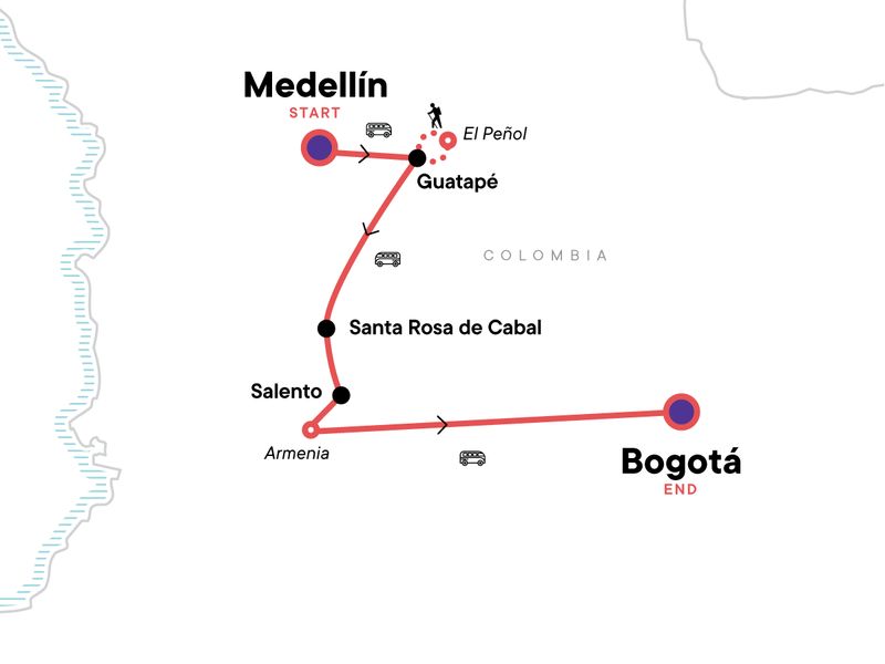 From friendly locals to vibrant neighbourhoods, misty mountains, and endless coffee-covered hills, this eight-day adventure from Medellín to Bogotá is packed with everything that makes Colombia unforgettable. Start your journey in an outdoor enthusiast’s paradise, then kick back in a small town bubbling with volcanic thermal pools. Wander through the lush green beauty of the Cocora Valley, where the landscape feels straight out of a dream. With grand colonial architecture, epic views from a towering granite rock, and a mix of hidden gems, you’ll experience the true heart of Colombia — far from the usual tourist trail.