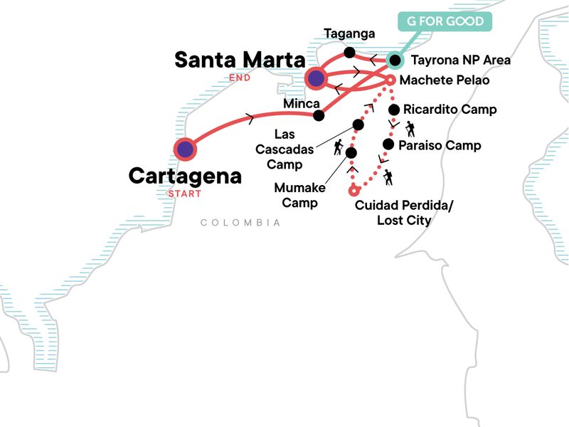 Your Welcome Moment: Welcome Moment - Meet Your CEO and Group. City tour in Cartagena. Tayrona National Park hike with local guide (5hrs). Taganga Orientation Walk. Trek to the Lost City with indigenous guide (5 days). Guided tour of the Lost City. All transport between destinations and to/from included activities.
