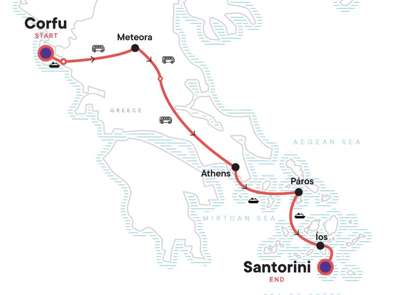 Hike across the island of Corfu, Walk through the incredible landscapes of Meteora amongst the mountaintop monasteries, Visit a G Adventures-supported community project in Athens, Go island-hopping as you cruise through the Mediterranean, Soak up the epic views in Santorini.