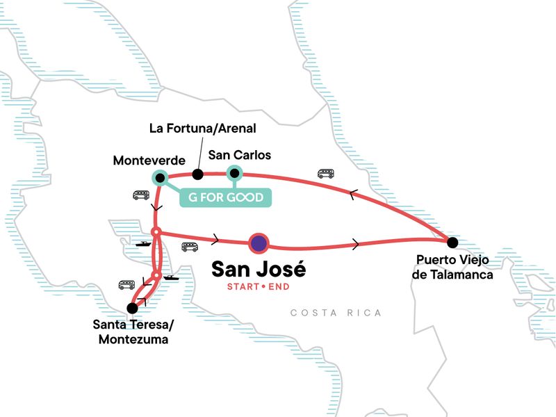 Your Discover Moment: Monteverde. Beach time in Puerto Viejo and Santa Teresa. Free time in La Fortuna and Monteverde. All transport between destinations and to/from included activities.