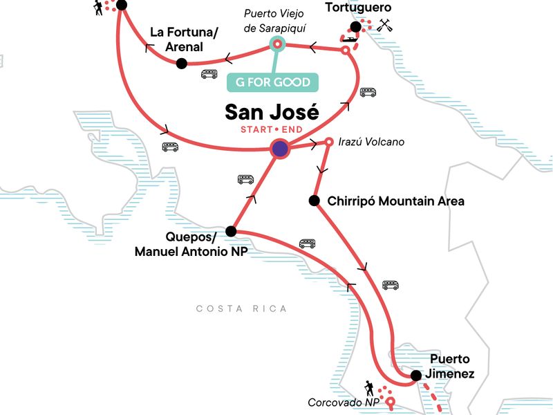 Your OMG Day: Wildlife Excursion or Waterfall Hike & Yoga, Chirripó. Complimentary arrival transfer. Welcome dinner. Two days of kayaking in Tortuguero National Park. Walk to a waterfall in San Miguel de Sarapiquí. Day pass at Tabacón Hot Spring Resort with dinner. Hanging bridges excursion to spot wildlife from La Fortuna. Hike to the Rio Celeste Waterfall in Volcán Tenorio National Park. Bikes & Bites tour in San Jose. Visit the viewpoints and walking trails of Irazú Volcano. Orientation walk of Puerto Jimenez. Full-day hiking and wildlife expedition into Corcovado National Park with a naturalist guide. Walk to a waterfall and have a traditional rural lunch at a mountain reserve. Half-day excursion into Manuel Antonio National Park with a naturalist guide. Farewell dinner. Departure transfer. All tips included for activities and meals, except for CEO and porterage. All transport between destinations and to/from included activities.