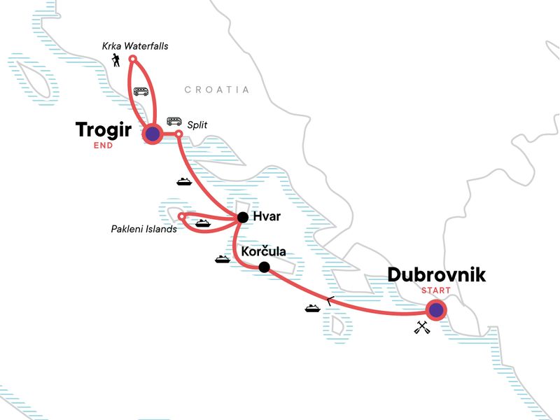 Croatia’s stunning coastline calls on this nine-day adventure through historic towns and dazzling Adriatic islands. Explore Dubrovnik from every angle — on foot, by kayak, and from a cable car ride to the mountain's peak. Hop on hydrofoils and high-speed catamarans to discover the islands of Korčula and Hvar, then sail by private boat to the Pakleni Islands for a day of walking, swimming, and sun-soaked bliss. Wander Split’s old town and hike to the breathtaking Krka Waterfalls. With a perfect blend of action, culture, and mouthwatering food, Croatia will capture your heart and leave you craving more.