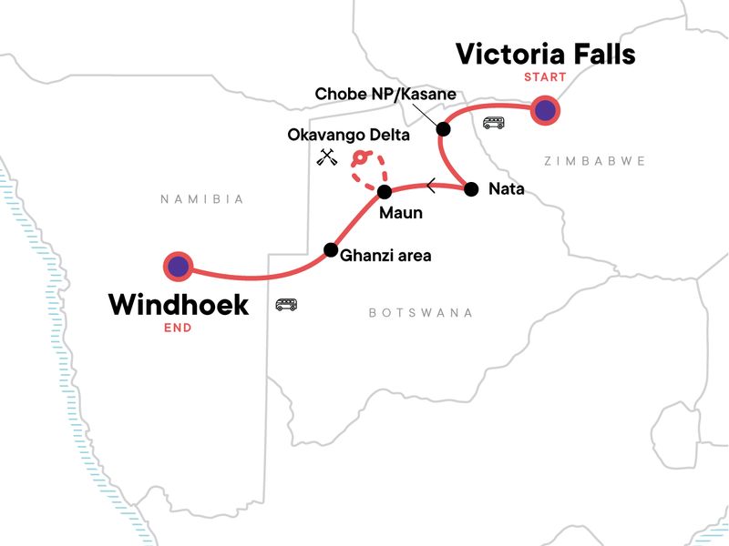Journey from Zimbabwe and Botswana and into Namibia on an incredible African adventure that includes the elephants of Chobe National Park and the mist of the thundering Victoria Falls. Meet San Bushmen in the blazing Kalahari and explore the Okavango Delta by traditional mokoro canoe. With a knowledgeable CEO at the helm and experiences that reflect local customs and traditions, including overnight stays in community lodges and tents, this tour is the trip of a lifetime.