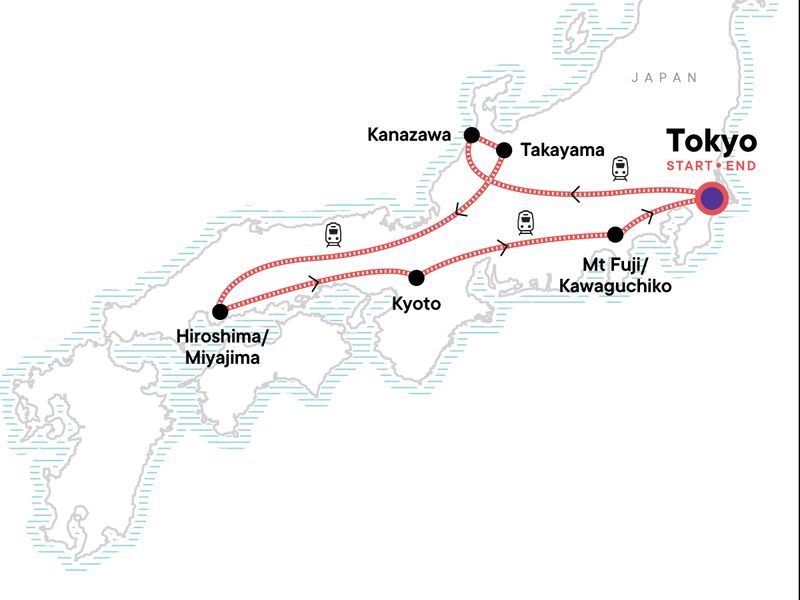 Your Discover Moment: Tokyo. Higashi Chaya District visit. Kenroku-en garden visit. Nagamachi Samurai District walk. Hida No Sato folk village visit. Hiroshima Peace Park and Museum visit. Miyajima Island excursion. Nijo Castle and gardens visit. Kinkaku-ji Golden Pavilion visit. Fushimi Inari Taisha Shrine visit. Lake Kawaguchiko (Five Lakes Region) walk. Kaiseki dinner. Japan Rail (JR) pass (14 days). All transport between destinations and to/from included activities.