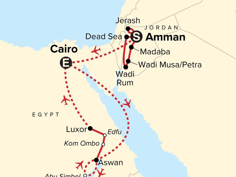 Your Foodie Moment: Cairo Food Tour, Cairo. Arrival transfer. Visit to the Amman Citadel and the National Archaeological Museum. Tour of Jerash and the Madaba mosaics. Visit Mount Nebo. Petra guided tour. Enjoy a traditional meal at Al Safi Kitchen, a G Adventures–supported café. Wadi Rum desert 4x4 excursion. Visit to Bethany. Guided visit to the Pyramids of Giza and Sphinx, Sakkara and the Step Pyramid of Zoser, and Philae Temple in Aswan. Visit to the Abu Simbel temple. Guided visit of the Valley of the Kings and Temple of Queen Hatshepsut. Guided visit to the tomb complex of El Kab and the temples of Edfu and Kom Ombo, and the temples of Karnak and Luxor. Visit the Grand Egyptian Museum. Visit the Hanging church St Sergius church & Ben Ezra Synagogue. Explore the Khan El Khalili market and Muiz Islamic street. Departure transfer. Internal flights on tour and all transport between destinations and to/from included activities