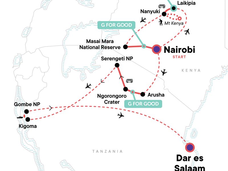 Your OMG Day: Mount Makarot Hike- Challenging or Moderate Trail, Ngorongoro Crater. Complimentary Arrival Transfer. Welcome and Farewell dinners. Maasai Guided Bush Walk and Safari Game Drive, Maasai Village Visit, Sweetwaters Chimp Sanctuary Tour, Ol Pejeta Conservancy Safari Game Drive, Hike Mt Kenya, Maasai Mara National Park safari game drive, Dinner in the Bush, Tree Planting Project, Complimentary Arrival Transfer. Welcome and Farewell Dinners. Elephant Caves Walk, Ngorongoro Crater Safari Drive, Serengeti Safari Drive, Chimp Trekking, Kakombe Waterfall Visit, Hike to Jane's Peak, Visit Jane Goodall's House, Visit Bongoyo Island.