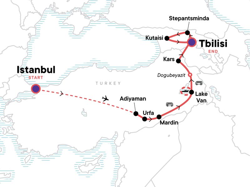Your Foodie Moment: Terragarden Cooking Class, Mtskheta. Istanbul orientation walk. Visit the Karakus Tumulous Monument. Sunset from the summit of Mt Nemrut. Gobekli Tepi archaeological site visit. Walking tour of Mardin. Boat ride on Lake Van. Walking exploration of Akdamar Island. Visit Van Castle. Ishak Pasha Palace Tour in Doğubeyazıt. Tour the Ari Complex. Tbilisi walking tour and Caravanserai Visit. Gergeti Trinity Church excursion. Friendship Monument visit. Gori Visit. Explore the ancient Uplistsikhe archaeological site. Kutaisi orientation walk. Martvili Canyon Boat Ride and Walking Trail. Visit Mtskheta and the Svetitskhoveli Cathedral. All transport between destinations and to/from included activities.